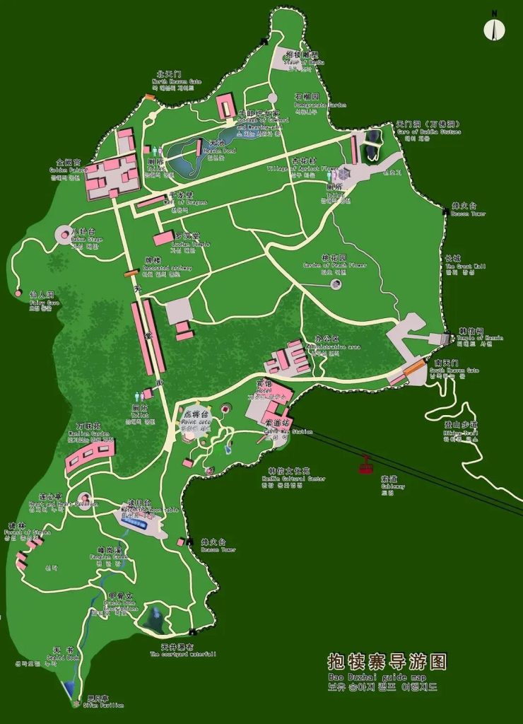 全國最大的山頂地下石雕群,羅漢堂前千龍壁,長36米,高13米。殿堂為地上、地下兩層建築,地上是“彌勒殿”,地下是“五百羅漢堂”。