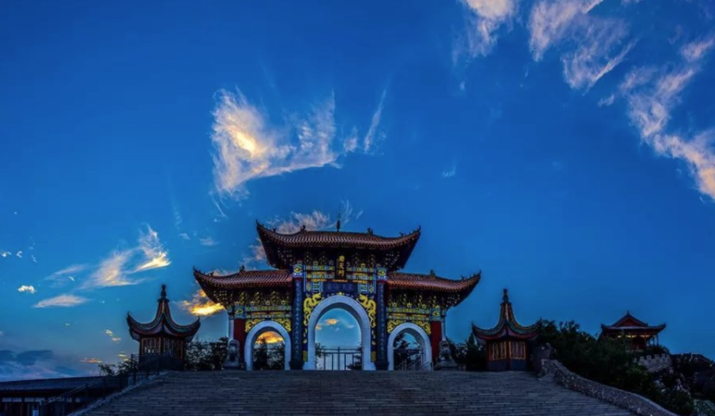 全國最大山頂門坊,高13.9米,寬23米。它既有牌坊的造型,又突出了門的特點,兩旁配有飛簷翹角的六角亭和雄踞的石獅。