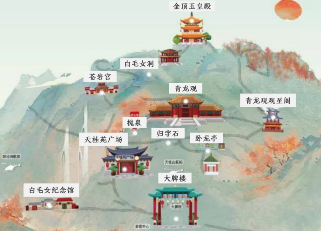 天桂山由青龍觀道院、玄武峰、萬佛岩、翠屏山、銀河洞、天橋山、白毛女藝術陳列館等八個景區組成。主峰海拔1270米,總面積60平方公裏。