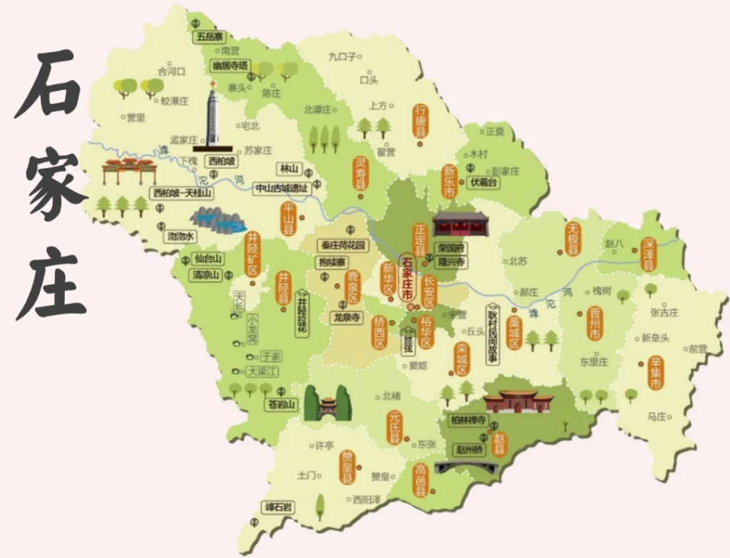 石家莊是我國重要紡織、醫藥工業基地,素有“南北通衢、燕晉咽喉”之譽。因中共中央在平山縣西柏坡指揮了三大戰役,又被譽為“新中國的搖籃”。