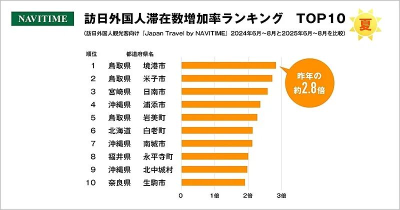就在最近,日本有名的換乘信息APP “NAVITIMEJAPAN”公布了“2025年夏季訪日外國遊客增加的地區榜單”,其中鳥取多地上榜。