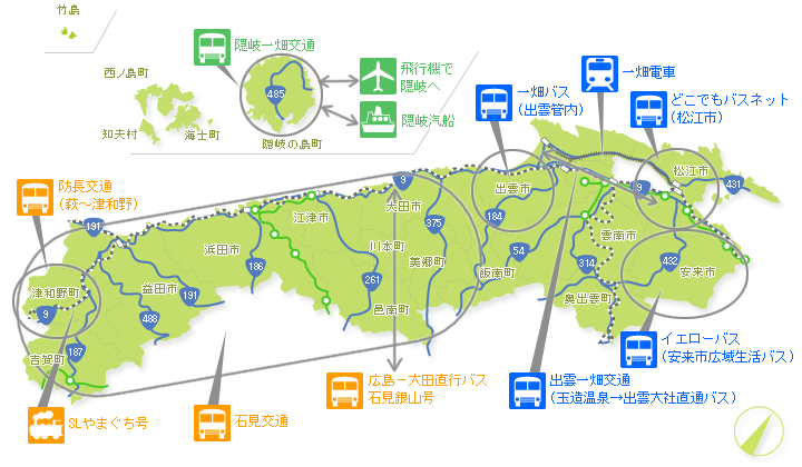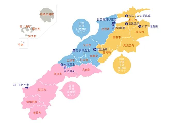 島根全縣東西狹長,大致被分為"出雲·大田·石見銀山"、"松江·安來·玉造·奧出雲",以及"益田·濱田·津和野"三個區域。