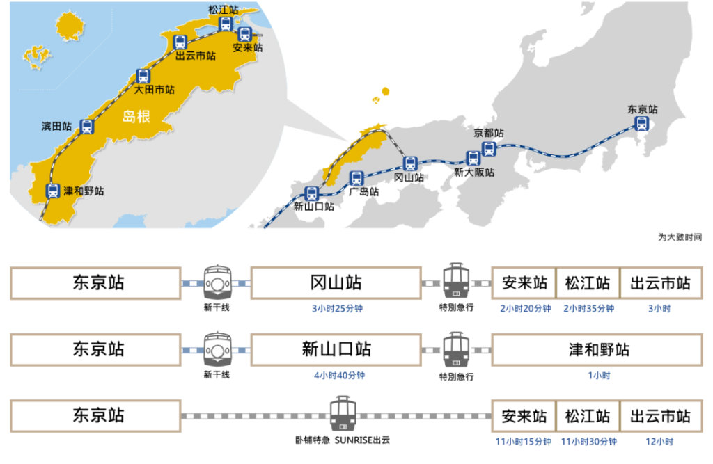 如果選擇電車出行,無論是從東京,京都,大阪,抵達島根最普遍的方式是乘坐新幹線在“岡山”或“新山口”站換乘。