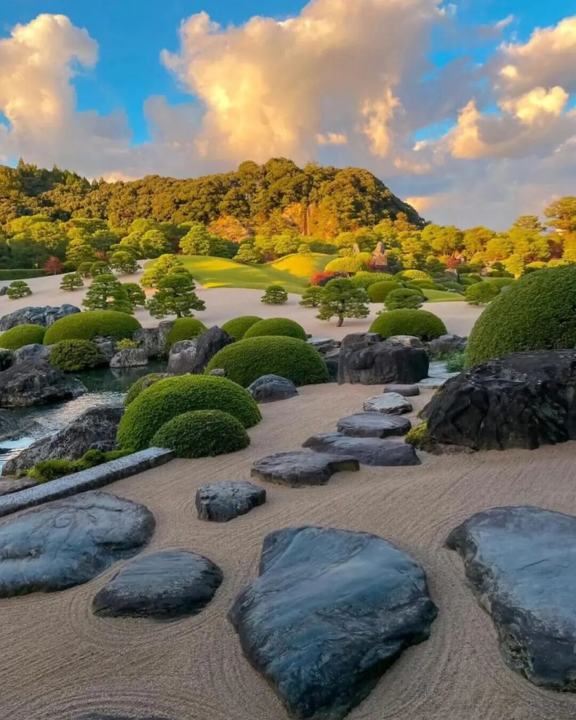 庭園總面積超過15萬平方米,借景出雲的群山,建造了包括枯山水庭、白砂青松庭、苔庭、池庭等六個風格各異的創意庭園。