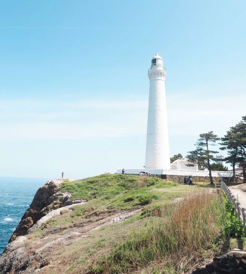 晴日下,被湛藍的海水環繞的白色燈塔,有種日劇般的清新浪漫。