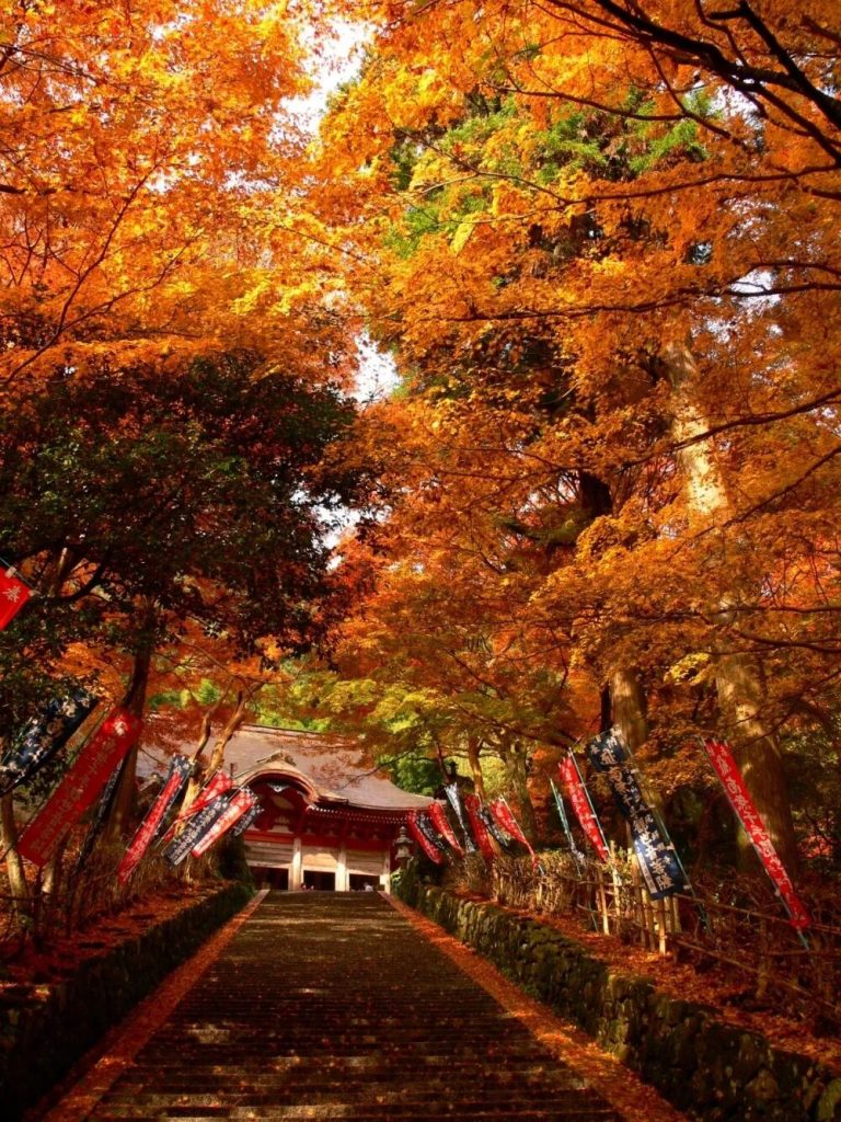到了秋天這裏便是一片火紅世界,層層疊疊的楓葉幾乎要堆滿整個視線,古老的建築掩映其間,禪意自然流淌,讓人流連其間。