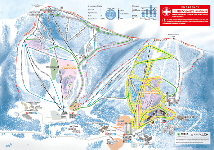 度假村滑雪場除了擁有北海道得天獨厚的粉狀雪質觸感之外,標高1239公尺的トマム(Tomamu)山帶給你山嶽滑雪場獨有的多樣地形,絕對可以讓你大呼過癮!