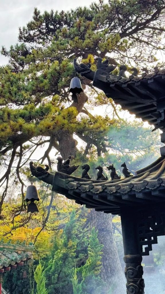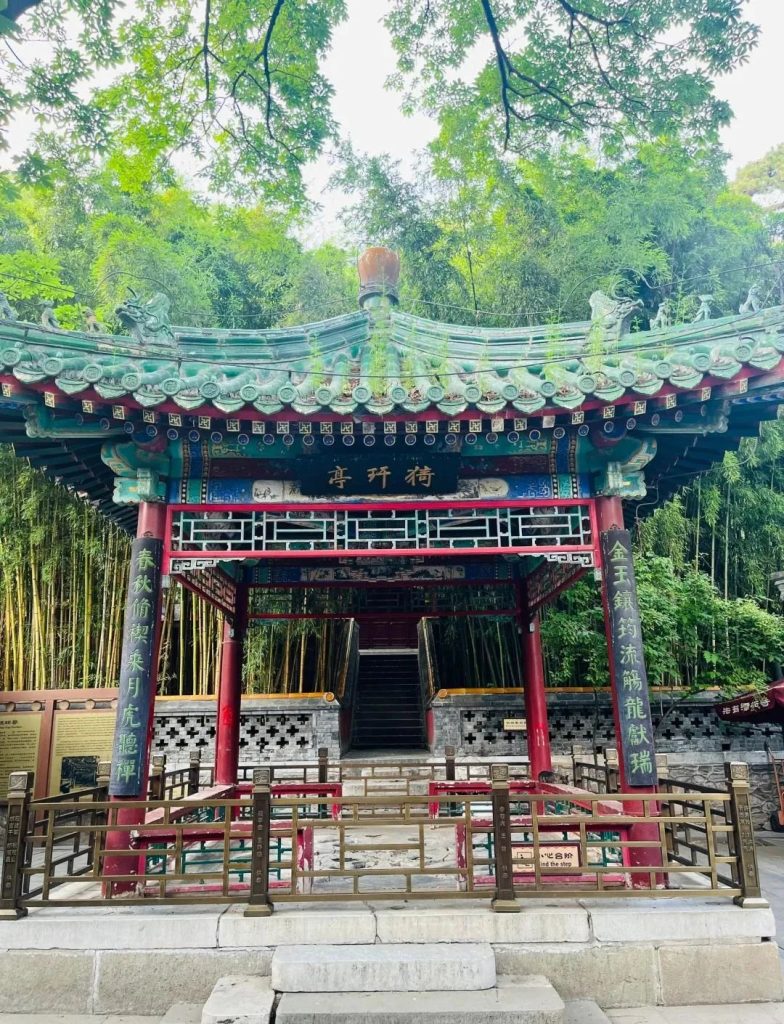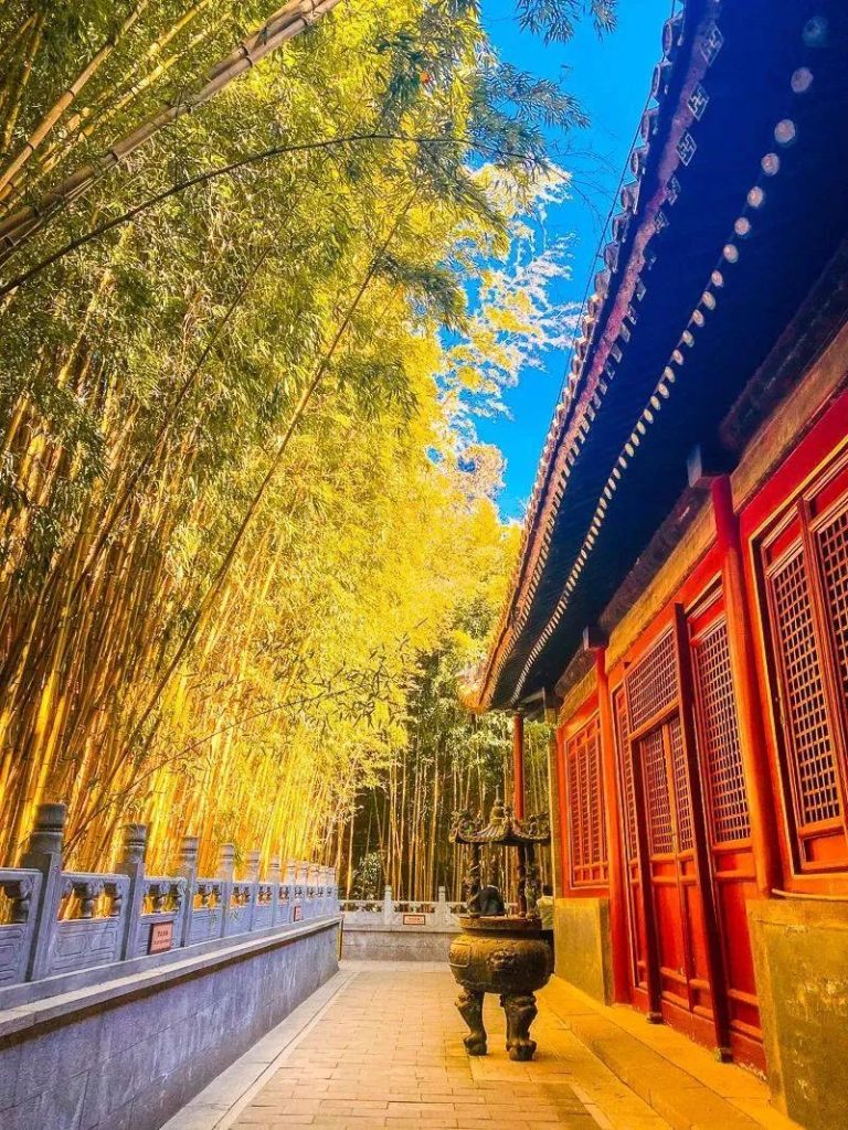 潭柘寺竹林院竹林院因院內種有兩池名貴的“玉鑲金”竹而得名,院內東房三間是禦書房,是皇帝在寺留住期間讀書和辦公的地方,門額上原掛乾隆皇手書“猗玕清淨”的匾額和“石山水流動皆靜;雲間山出幻且寧”的對聯,後來又將這幅匾聯移到了院中的流杯亭上。院內原來還有配房七間,北側的三間是嬪妃宮,南側的四間是侍衛房,後來拆除。