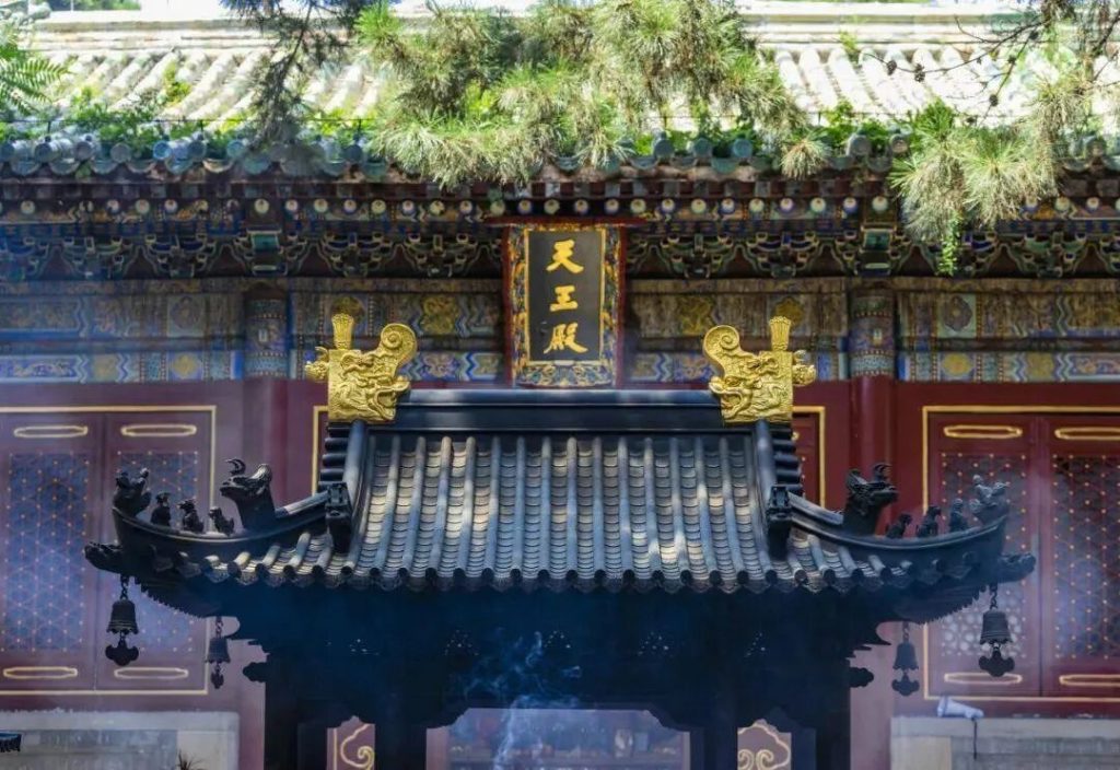 潭柘寺天王殿天王殿,面闊三間,歇山頂,綠琉璃瓦屋面,簷下懸康熙皇帝禦筆“天王殿”匾。殿內正中供奉彌勒佛像,背後供奉韋馱像,東西兩側供奉四大天王神像。