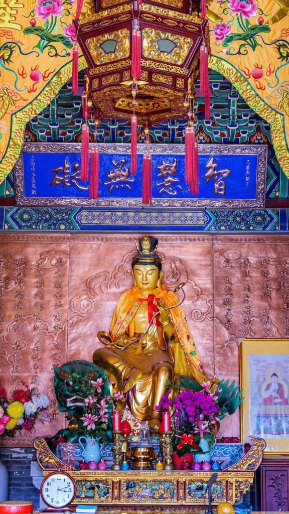 潭柘寺觀音殿觀音殿位於毗盧閣後面一個獨立院落中,是全寺中所處地勢最高的一座建築,門額上高懸著清乾隆皇帝所題“蓮界慈航”的匾額。殿內正中供奉著觀音菩薩像。觀音像前兩側侍立著龍女和善財童子。在殿內左側存放有元世祖忽必烈的女兒妙嚴公主的“拜磚”。