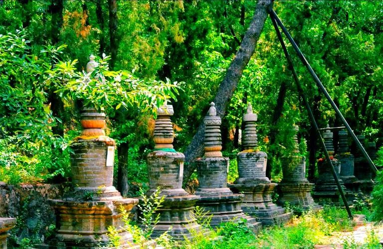 潭柘寺上塔院潭柘寺塔林保存著形式多樣的曆代佛塔七十餘座。下塔院的塔林埋葬著金、元、明三代的部分高僧,塔形不一,種類較多,有石經幢式塔、方形單層浮層屠式塔、密簷式磚塔和覆缽形藏式石塔。潭柘寺修建最早的塔是下塔院的海雲禪師塔,至今已有800多年的曆史。此塔為六面六角密簷式實心磚塔,共有七層,正面鑲有塔額,上寫“佛日圓明海雲禪師塔”。潭柘寺廣慧通理禪師塔塔林中最高大的墓塔為金代的廣慧通理禪師塔,此塔位於下塔院的中心,塔高九層,也是密簷式實心磚塔,塔前設有石供桌,塔前左右兩側還各有一株千年娑羅樹。