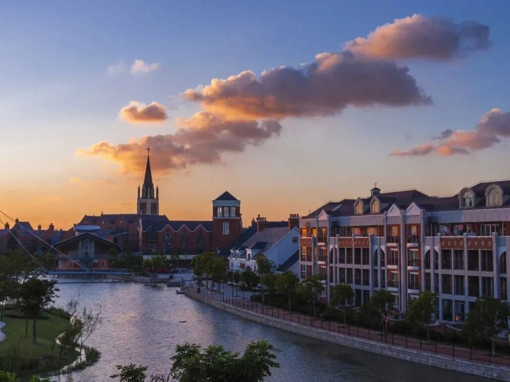 華亭湖為這座英倫小鎮勾畫出了亮麗的親水岸線,小鎮的紅牆、白窗在華亭湖的映襯下,顯現出了濃鬱的異域風情。