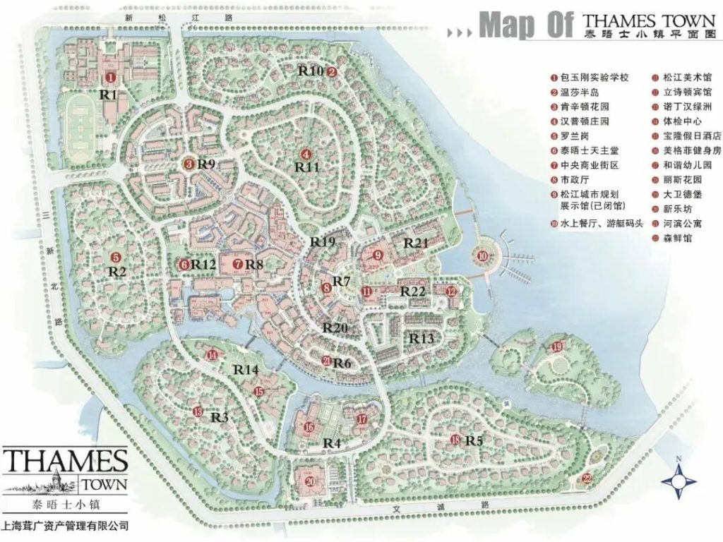 泰晤士小鎮位於松江新城的核心區域,總建築面積50萬平方米,容積率為0.5,綠化覆蓋率達到60%。東起海斯大街,南至肯特大街,西至肯特大街,北至蘇荷大街、伯克大街,石徑蜿蜒曲折,四通八達,沿街有英式住宅,教堂,城堡,處處點綴著精致的雕塑,形態各異。