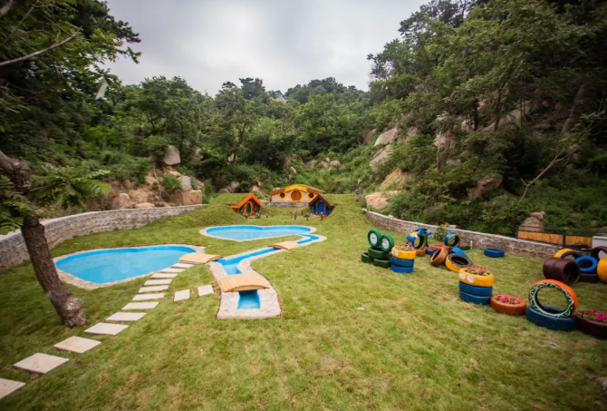 民宿備有漢服和古裝,可免費提供專業拍攝。兒童娛樂區,水池瀑布可戲水捉魚,兒童滑梯及霍比特小屋,已成為親子網紅打卡地。