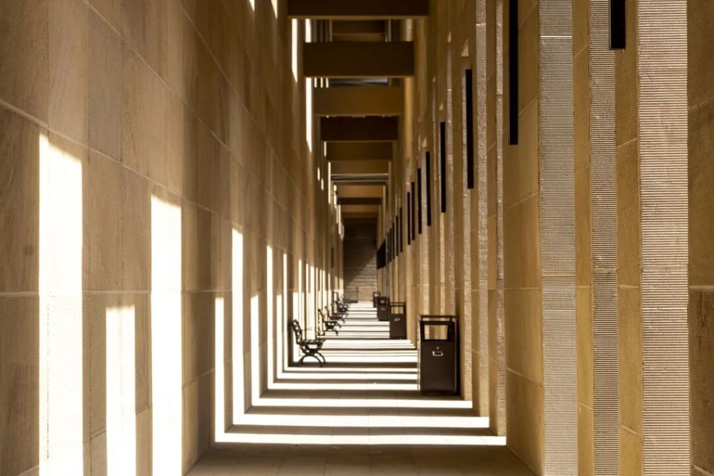 從博物館裏出來後,站在出口的光影回廊裏,在陽光的映襯下,空間的延伸感隨手一拍就是時尚大片。