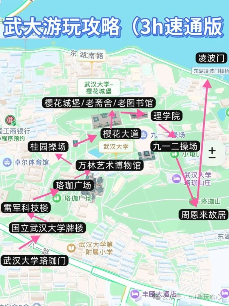 國立武漢大學牌樓(新)➟ 雷軍科技樓 ➟ 珞珈廣場 ➟ 萬林藝術博物館 ➟ 桂園操場 ➟ 櫻花大道 ➟ 櫻花城堡/老齋舍/老圖書館 ➟ 理學院 ➟ 九一二操場 ➟ 行政樓 ➟ 周恩來故居 ➟ 淩波門