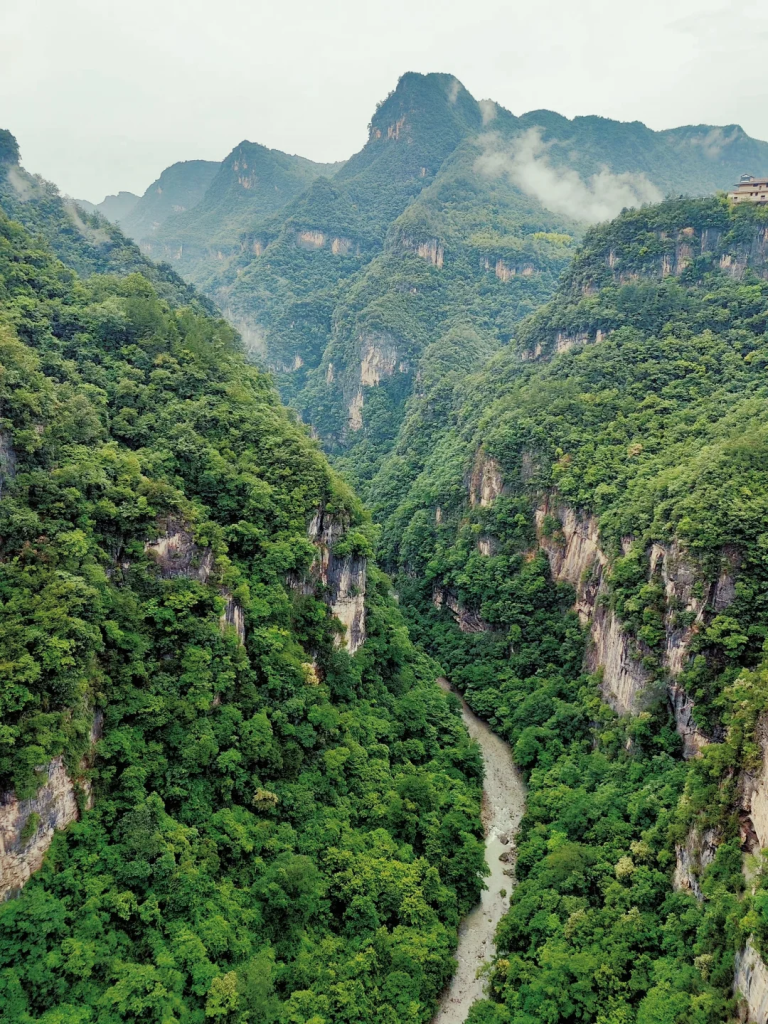 峽穀中溪流奔騰,瀑布水量充沛水霧繚繞間綠意蔥蘢。