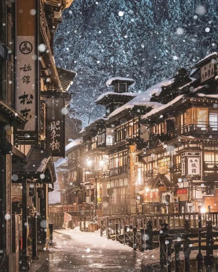 銀山溫泉位於山形縣的尾花澤市,因為500多年前發現銀礦而得名。這裏的冬季有著豐富的降雪,溫泉街上的百年木屋銀裝素裹,如夢似幻,仿佛時光就此靜止。銀山川清冽的河水冒著熱氣穿流其中,氣氛寧靜,宛如世外桃源,還有被譽為現實版《千與千尋》中的油屋。