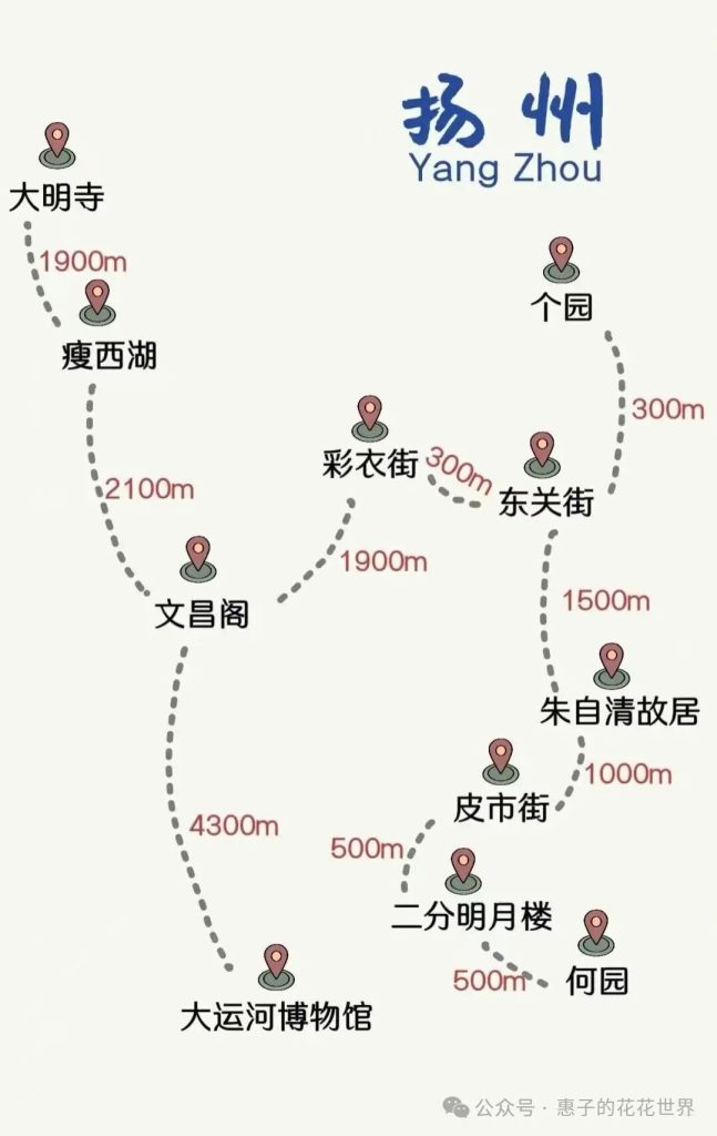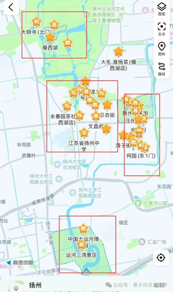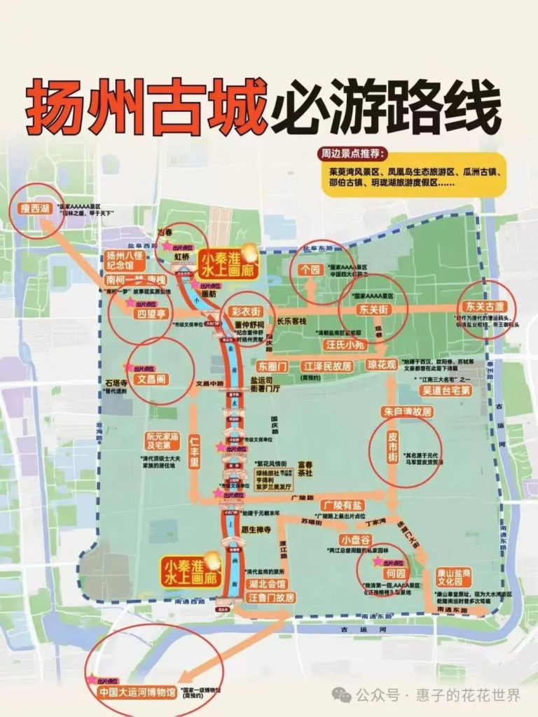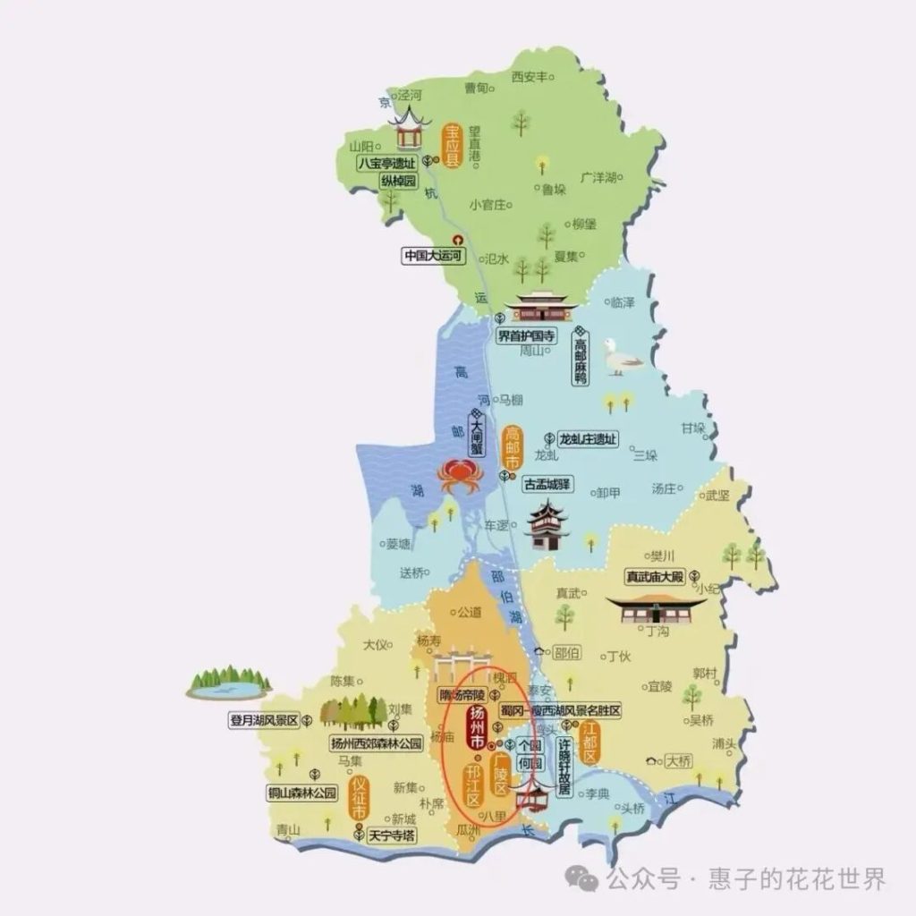 👇如下地圖,可以把揚州分為四大板塊去規劃線路。