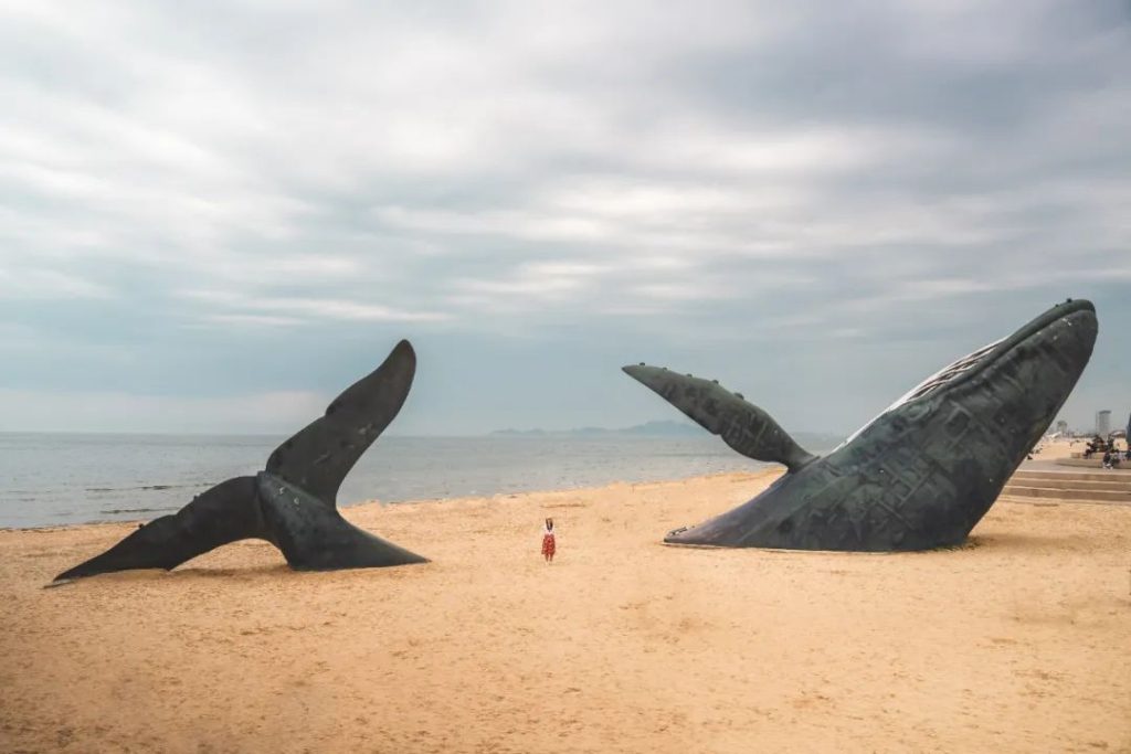 這裏非常有名的雕塑是一只擱淺的鯨魚,背鰭倒插在沙灘上,背後就是一望無際的大海,有種淒涼孤獨但又震撼的感覺。