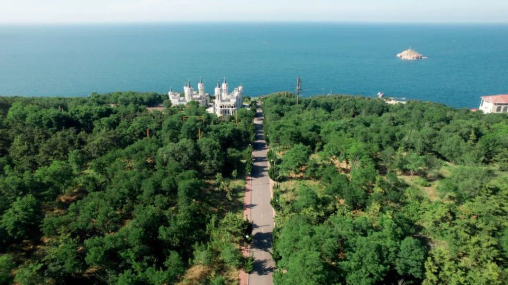 繼續往前一直到蓮花夕照這段路上,會有很多觀景台,可以邊騎邊玩,遇到喜歡的就停下來。我們中間還去了益壽路,這是一條從山坡往下通向大海的公路,兩邊是鬱鬱蔥蔥的樹木,還有棟城堡一樣的房子,航拍很好看。