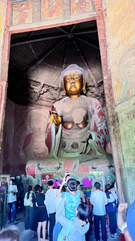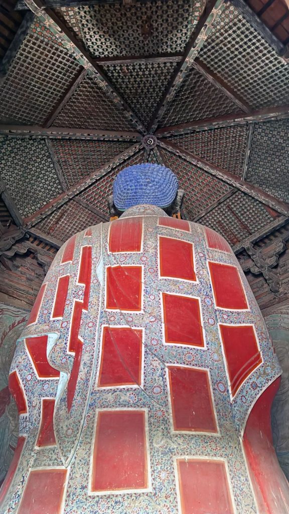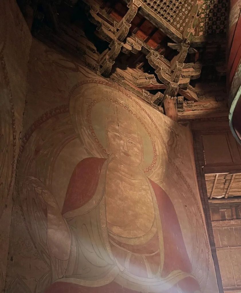 釋迦牟尼佛端坐於八角蓮台,通高10.32米,淨高8.48米,左手施與願印、右手施無畏印,袈裟腹部三組團龍戲金雲與周身行龍紋,彰顯遼代皇家造像的尊貴。佛像頭高2.63米,頭身比1:3.23,符合“盤三半”的遼塑標准,與內壁六幅如來壁畫共同構成“七佛格局”。