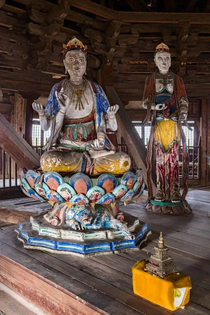 方形壇座上,主佛(通高4.05米)與文殊、普賢及二脅侍菩薩構成“一佛四菩薩”組合。主佛結觸地降魔印,衣紋延續唐代“曹衣出水”技法,頭高0.88米,頭身比1:3.56,與匠人口訣“坐五”完全吻合。