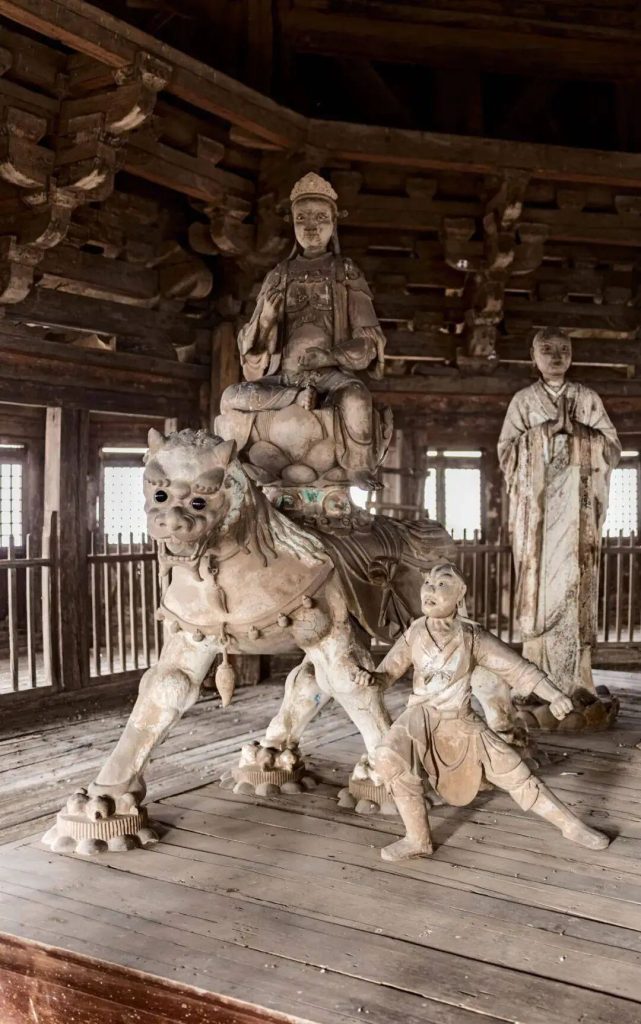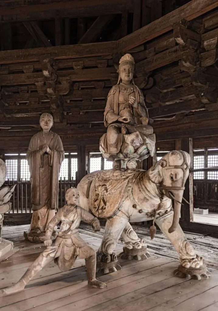華嚴三聖像中,釋迦牟尼佛(通高4.27米)居中,文殊騎獅、普賢乘象分列兩側,二菩薩單腿垂坐於獸背蓮座,呈“舉右手垂左足”與“舉左手垂右足”的鏡像對稱。獅象昂首闊步,昆侖奴(胡人裝束)緊握韁繩,肌肉線條充滿張力,其翻領窄袖長袍與長靴細節,保留了遼代“絲綢之路”的文化印記。