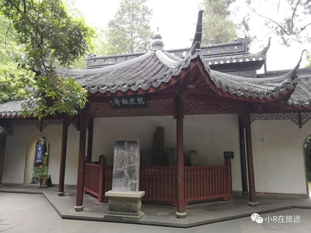 正殿西面有一組庭園,入口處有精忠柏亭,內有枯柏8段,傳說這棵柏樹原在大理寺風波亭邊上,岳飛遇害後樹就枯死了,後來就移放在岳墳邊上,稱為精忠柏。