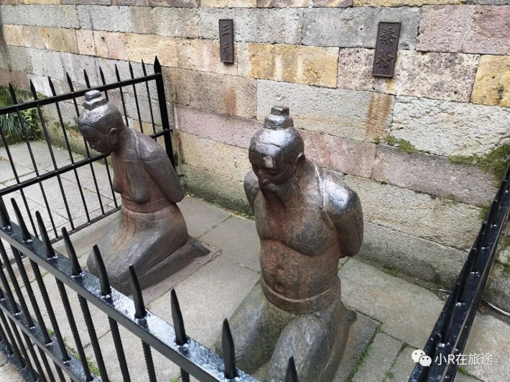 岳飛墓闕是1979年整修時按南宋建築風格設計的,墓道兩旁陳列的石虎、石羊、石馬和石翁仲,是明代的遺物。墓闕下有四個鐵鑄人像,反剪雙手,面墓而跪,即陷害岳飛的秦檜、王氏、張俊、萬俟卨四人。跪像背後墓闕上有楹雲:“青山有幸埋忠骨,白鐵無辜鑄佞臣。