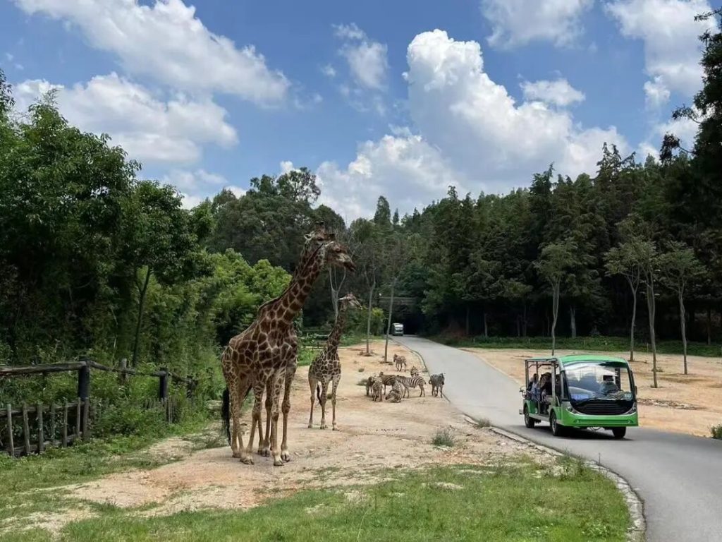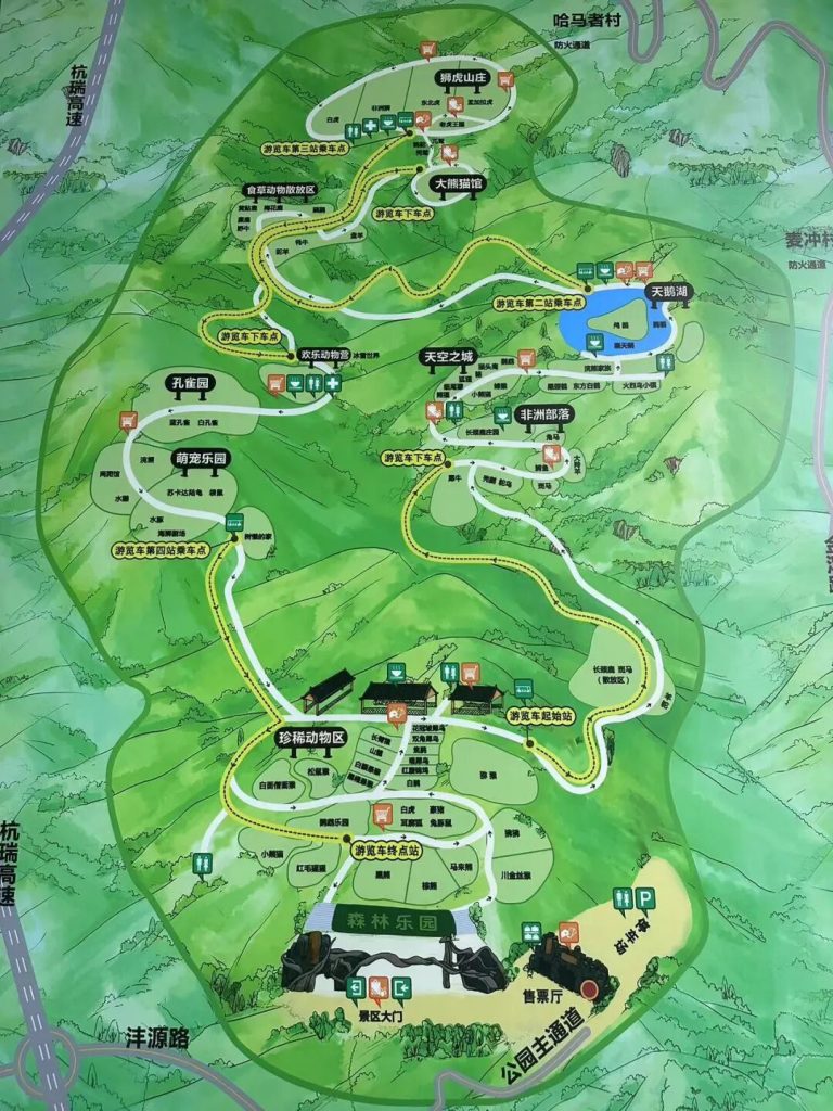 珍稀動物區一遊覽車起始站一非洲部落一天空之城一天鵝湖一遊覽車第二乘車點一食草動物散放區一大熊貓館一獅虎山莊一遊覽車第三乘車點 一歡樂動物營一孔雀園一萌寵樂園一 遊覽車第四乘車點 一珍稀動物區