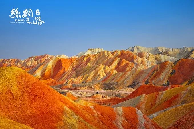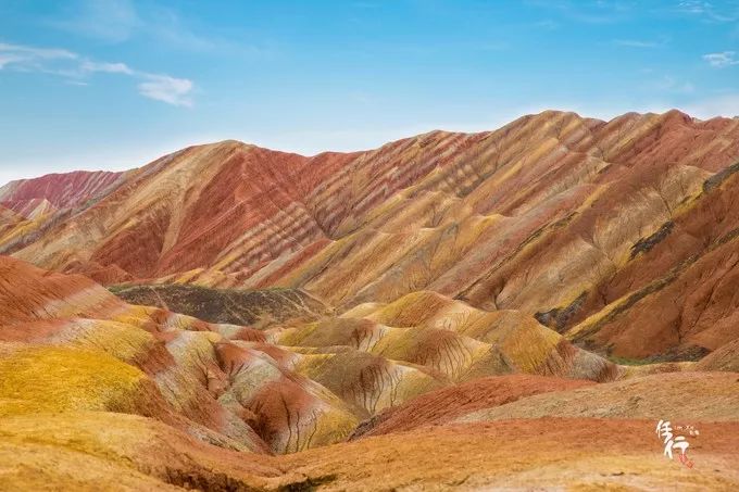 七彩丹霞最震撼的莫過於色彩,一層黃色,一層火紅色再配上一層淡淡的土黃色,整個丹霞山脈像是剛從磚窯裏燒制出來的工藝品,層次分明,線條曲折,連綿起伏,帶給你無限驚喜,猶如上帝打翻的調色盤,你永遠不知道,它經曆了怎樣的風雨侵蝕,日積月累,才形成今天層次分明的色彩。