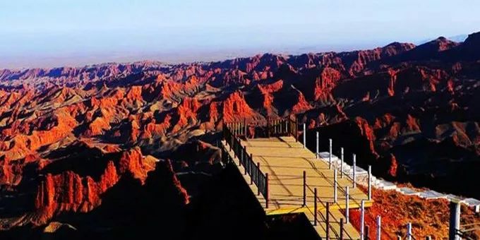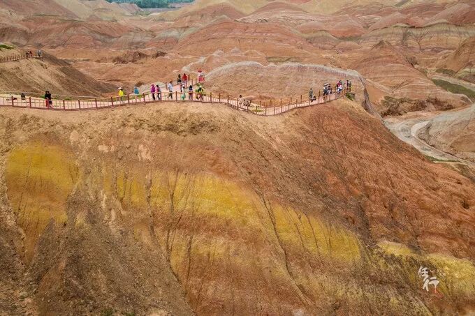 3號觀景台看顏色靚麗的七彩丹霞,在3號看到的那座山丘主色調是紅橙黃,必須是傍晚的斜陽照射下最漂亮!(若上午去背光,色彩差很多!)從2號觀景台下來後,有另一條棧道可以直接通往3號觀景點,一路都可以看著這抹火紅!3 號觀景台可以看到著名的七彩扇,而且還可以坐滑翔機觀賞丹霞!