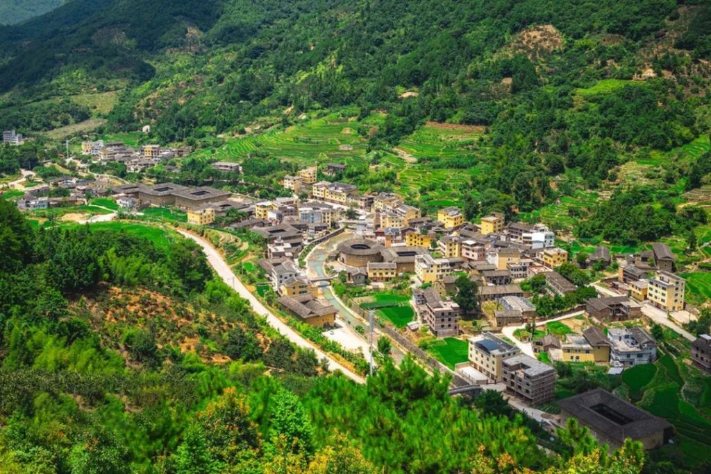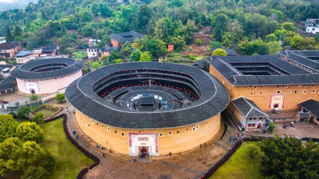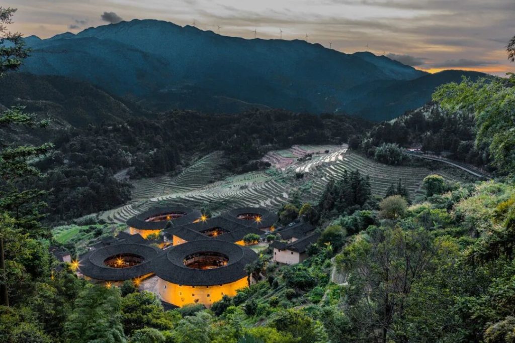 福建土樓是世界上獨一無二的集居住和防禦功能於一體的山區民居建築。倚山偎翠,方圓錯落,山下層層疊疊的梯田與土樓完美勾勒出一道恬靜的田園風光。永定土樓被譽為“世界上獨一無二的山村民居建築”,全縣有圓樓360座,方樓4000餘座,因其奇特的建築藝術和蘊藏的客家文化內涵而備受世人矚目。