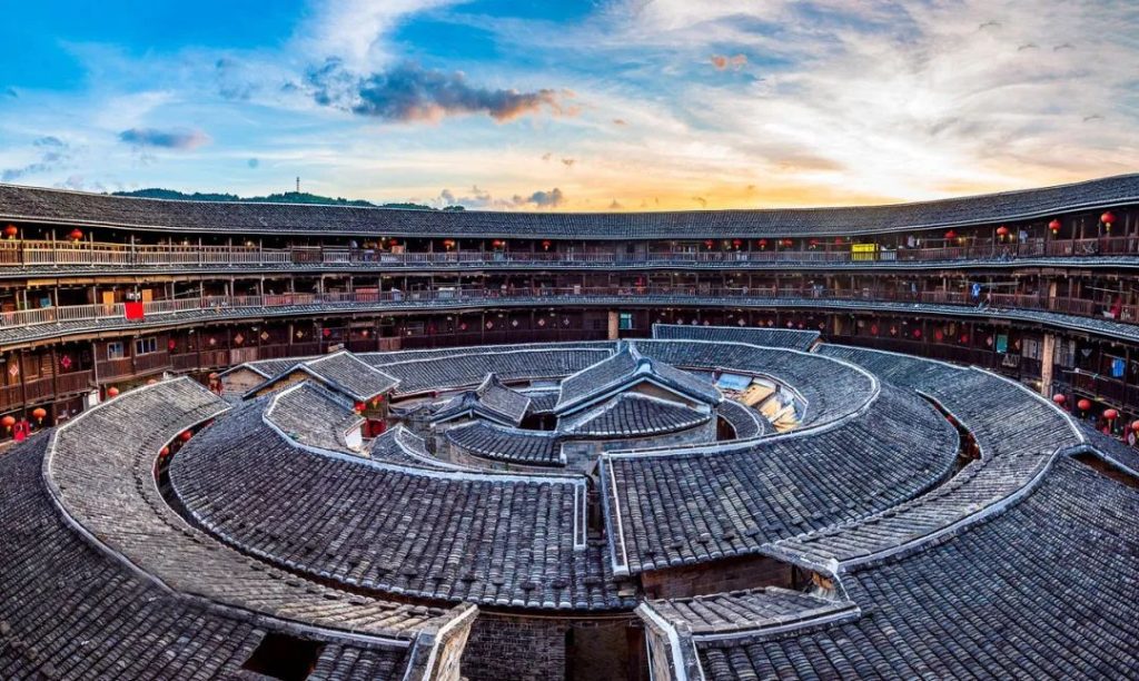 ①承啟樓:有土樓之王的美譽,據傳從明崇禎年間破土奠基,至清康熙年間竣工,曆世3代之久,其規模巨大,“高四層,樓四圈,上上下下四百間;圓中圓,圈套圈,曆經滄桑三百年”,1986年,中國郵電部發行了一套“中國民居”郵票,龐大的承啟樓正是借助這方寸的郵票名揚四海。