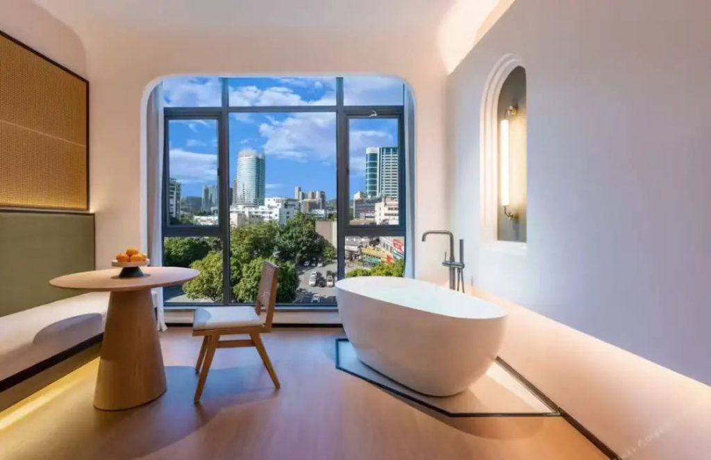 酒店是奶油風裝修,融合宋氏美學,色調溫暖柔和,簡約又有格調。且整體環境安靜優雅,隔音良好,利於安穩入睡。設施智能化且齊全,配備智能馬桶、投影設備等。有免費自助洗衣房和健身房。本店無需押金。